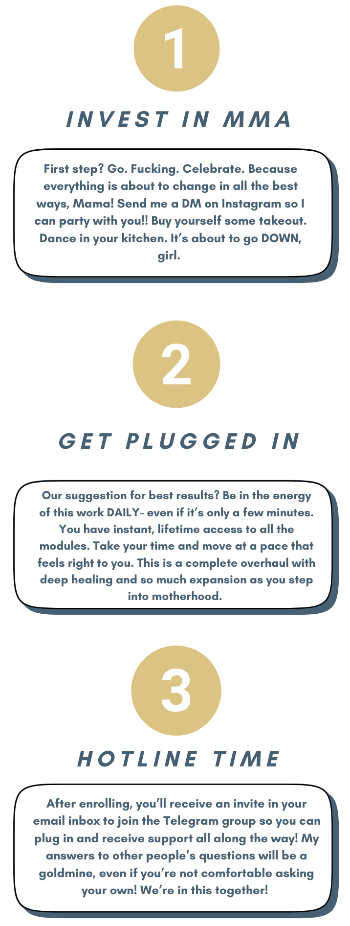 MMA is specifically curated based on data driven results from over four years of my coaching and hundreds of previous students and clients who now have babies in their arms. This framework covers exactly what has truly moved the needle for them and rocketed them into a quantum jump, miracle status Motherhood timeline. No fluff. No bullshit.
